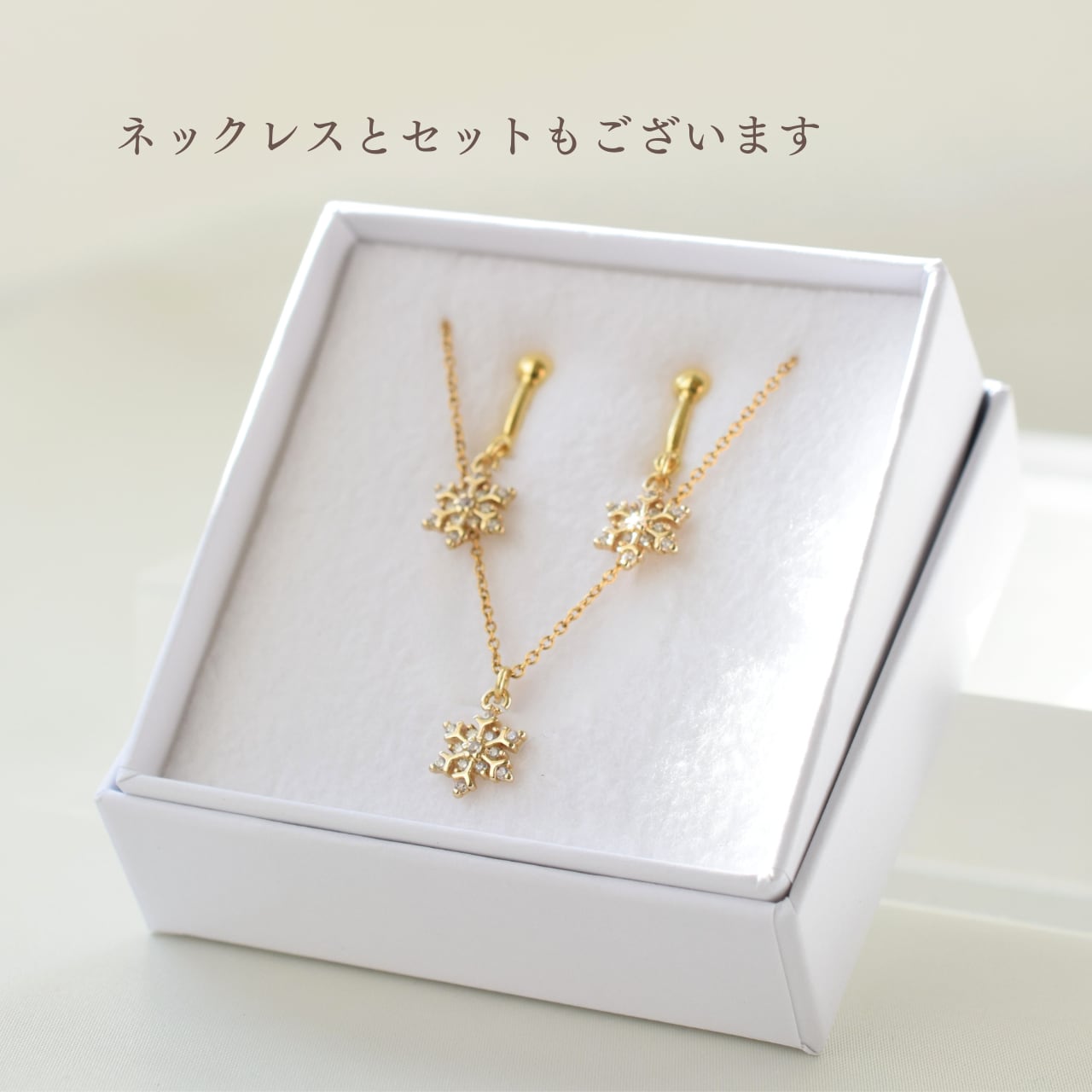 光の屈折率(輝き)がダイヤモンドとほぼ同様の人工石、キュービックジルコニアが埋め込まれた雪の結晶モチーフイヤリング。