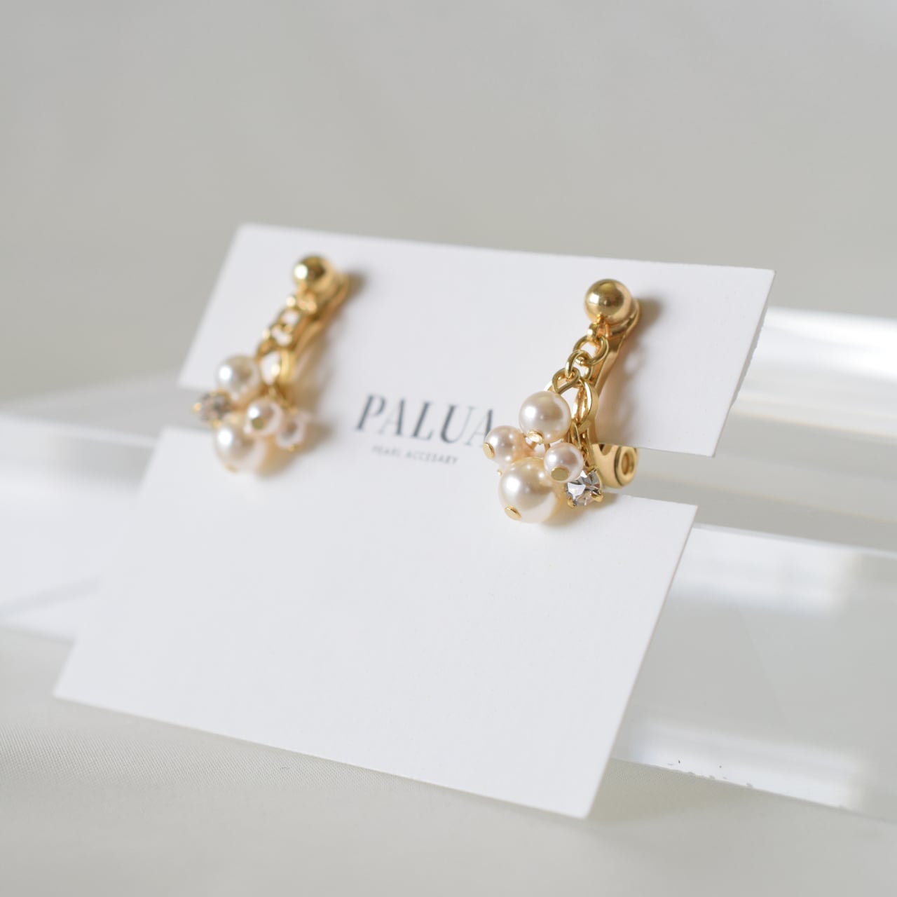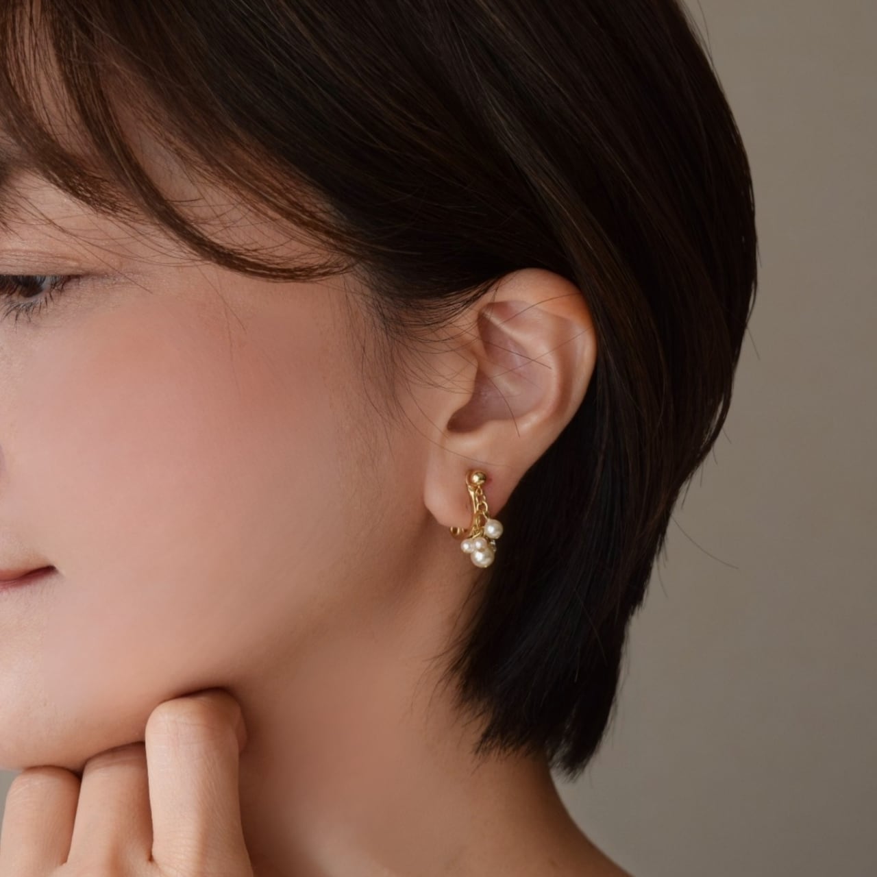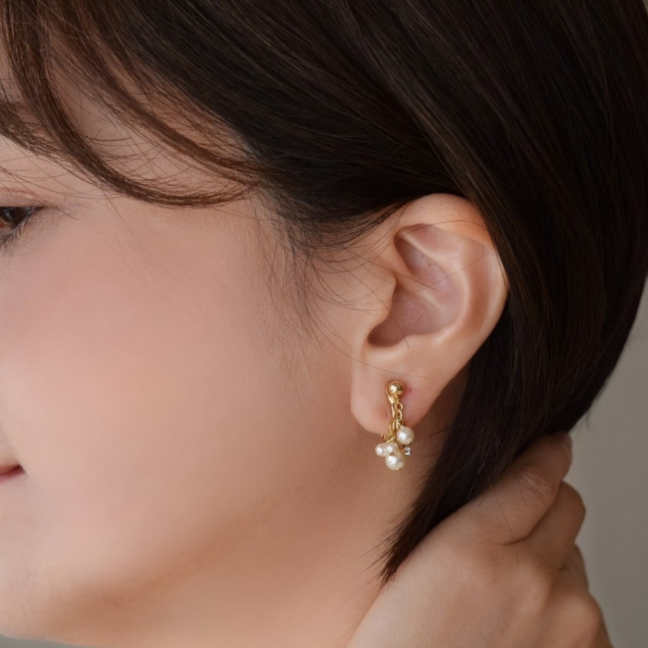 様々なサイズのパールが集まり、小刻みに揺れるデザインが可愛いパールイヤリング。