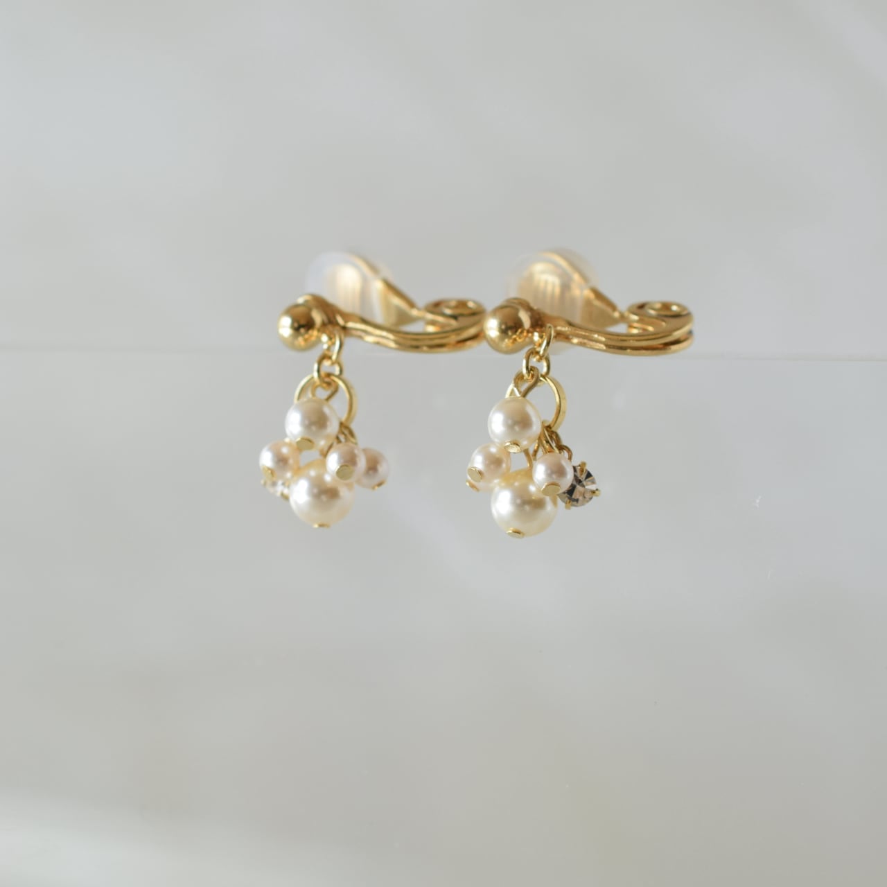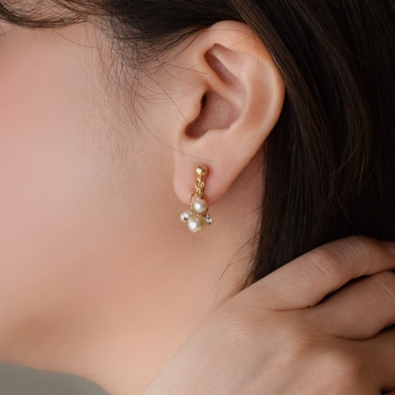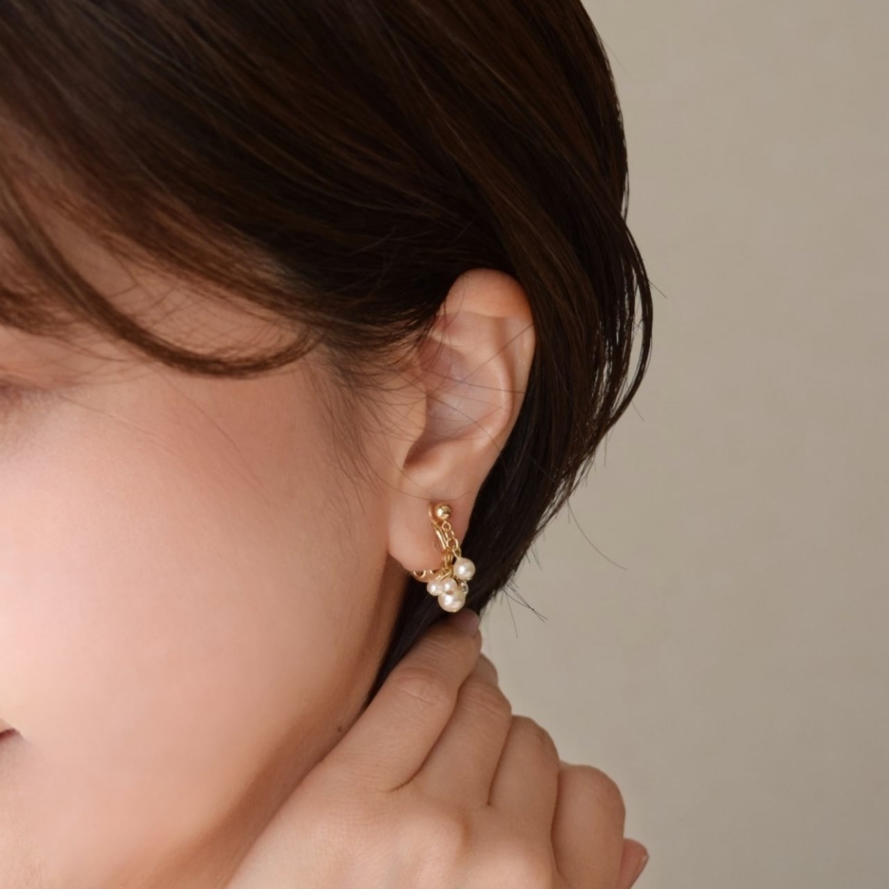 様々なサイズのパールが集まり、小刻みに揺れるデザインが可愛いパールイヤリング。