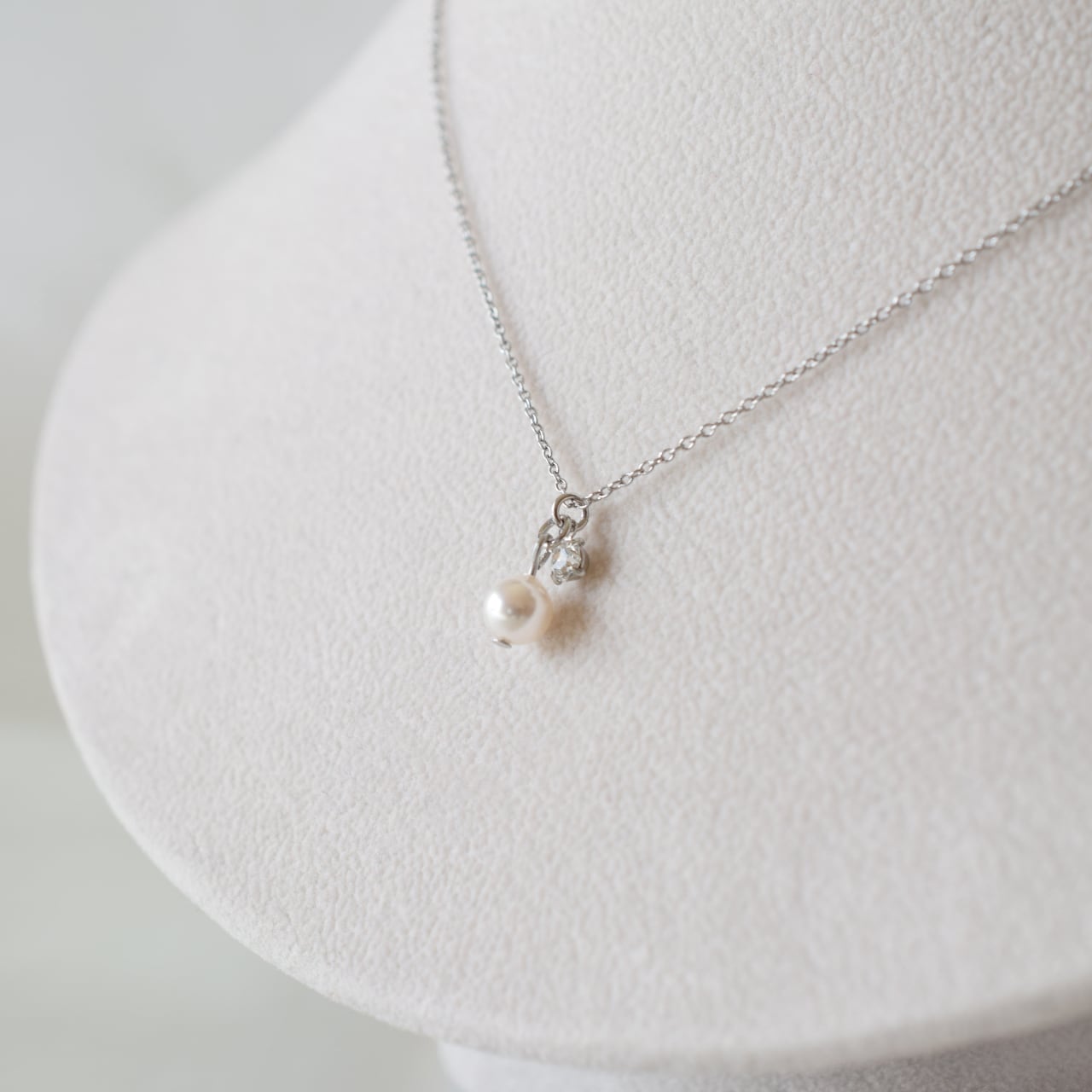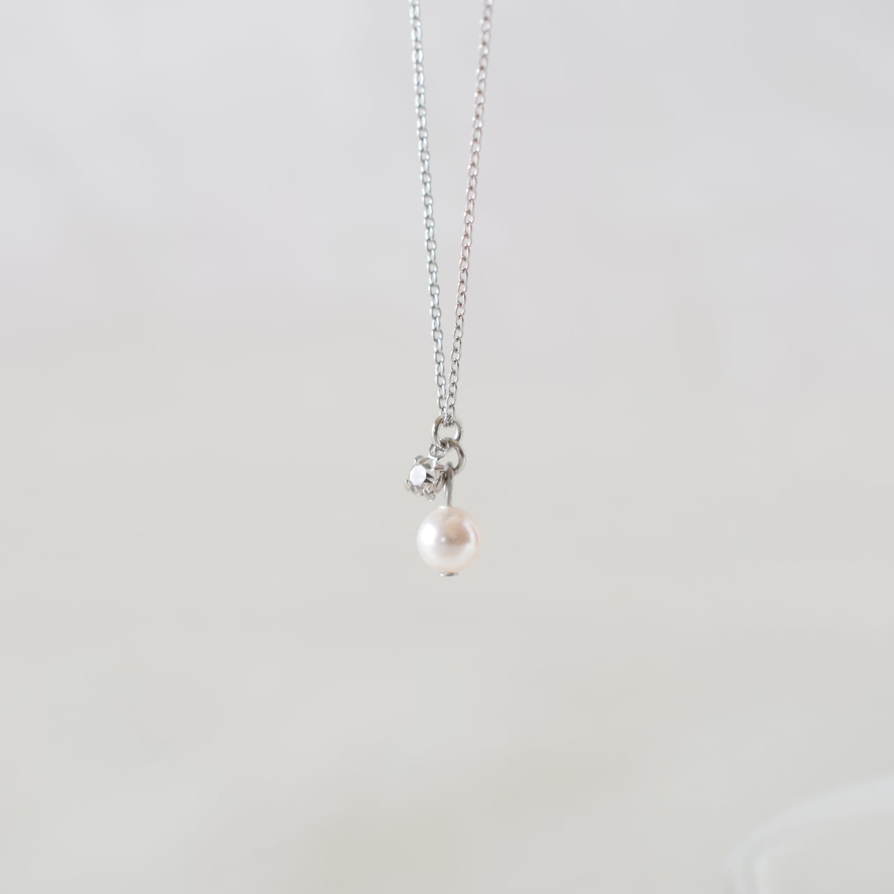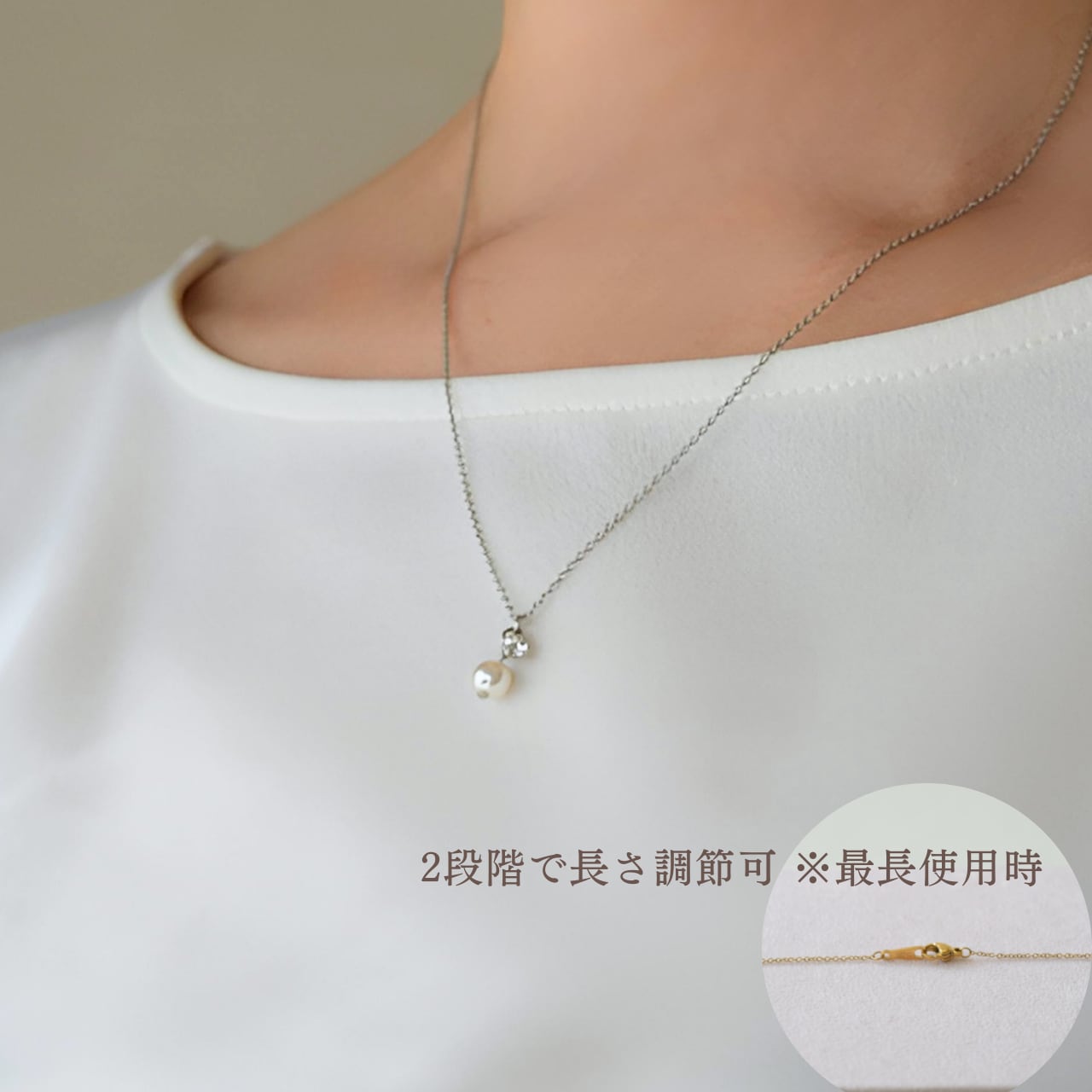 ロングチェーンの先に艶のあるパールとストーンをあしらったデザイン。