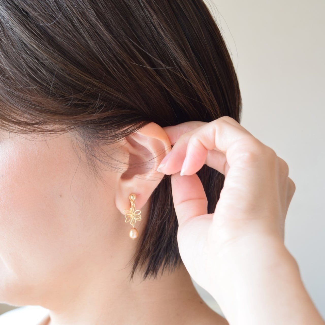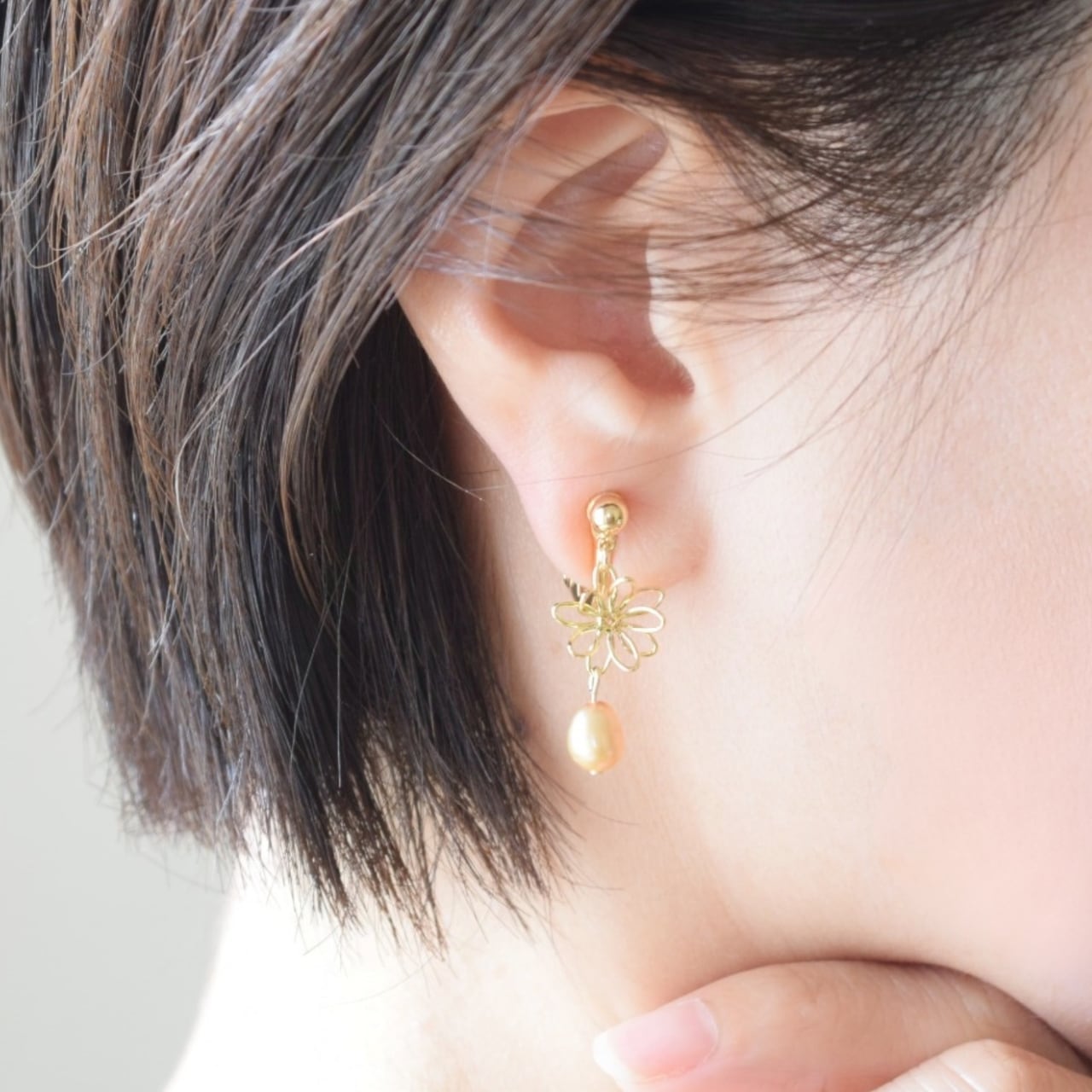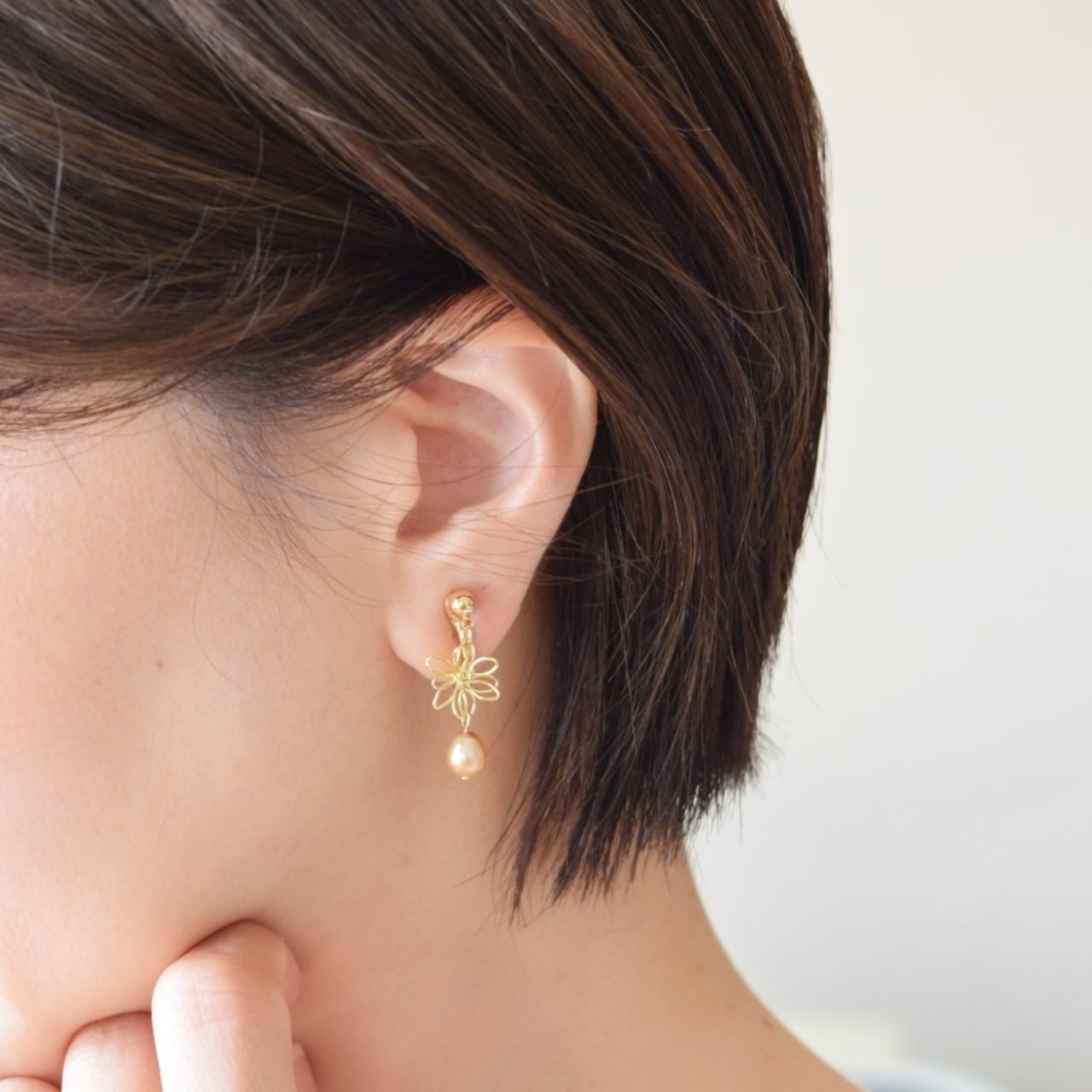 ワイヤーで成形した立体的なデザインのフラワーモチーフに、パールを合わせたデザイン。