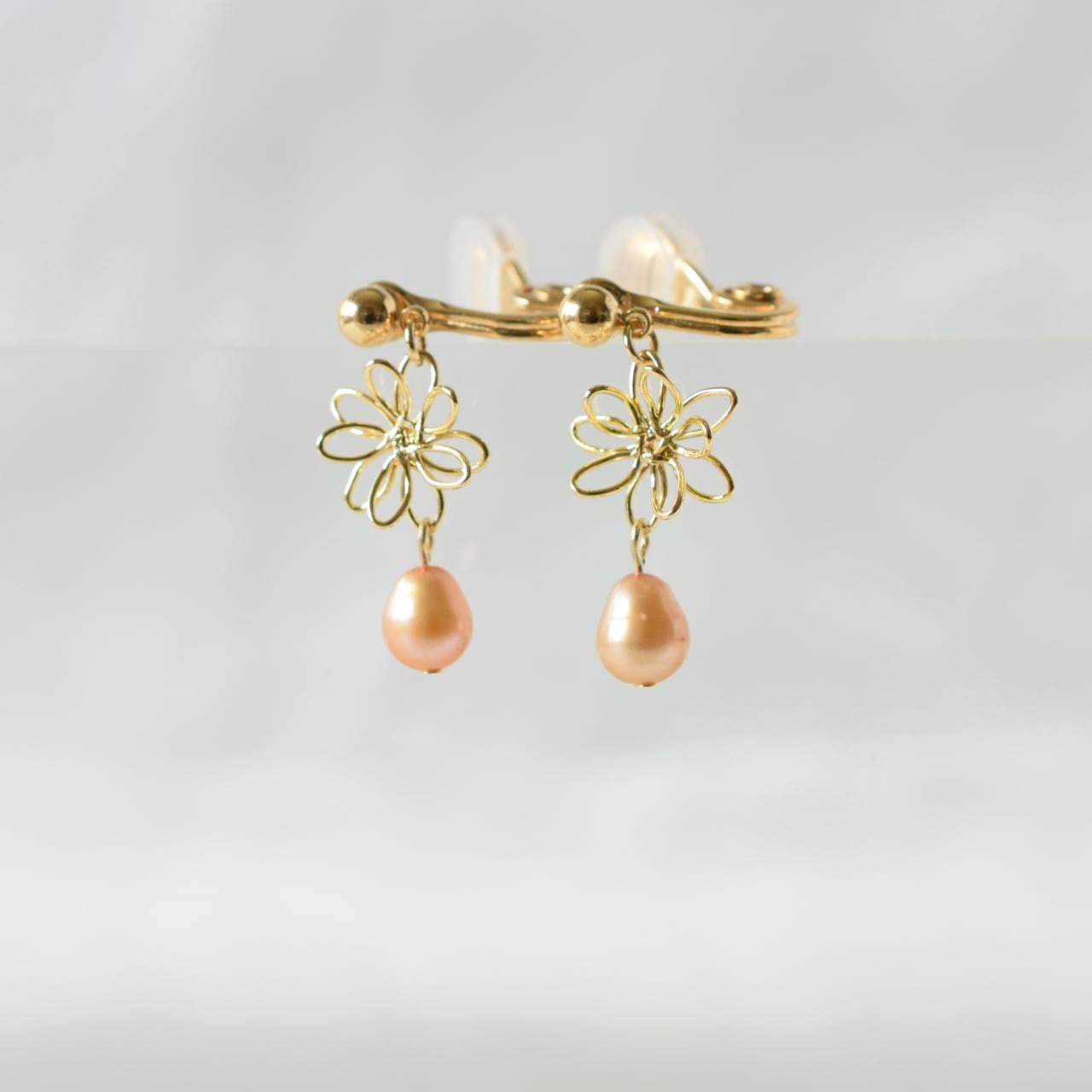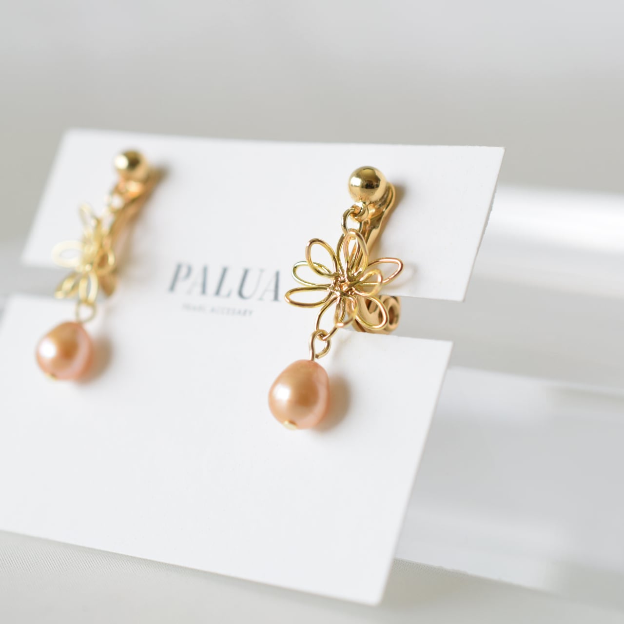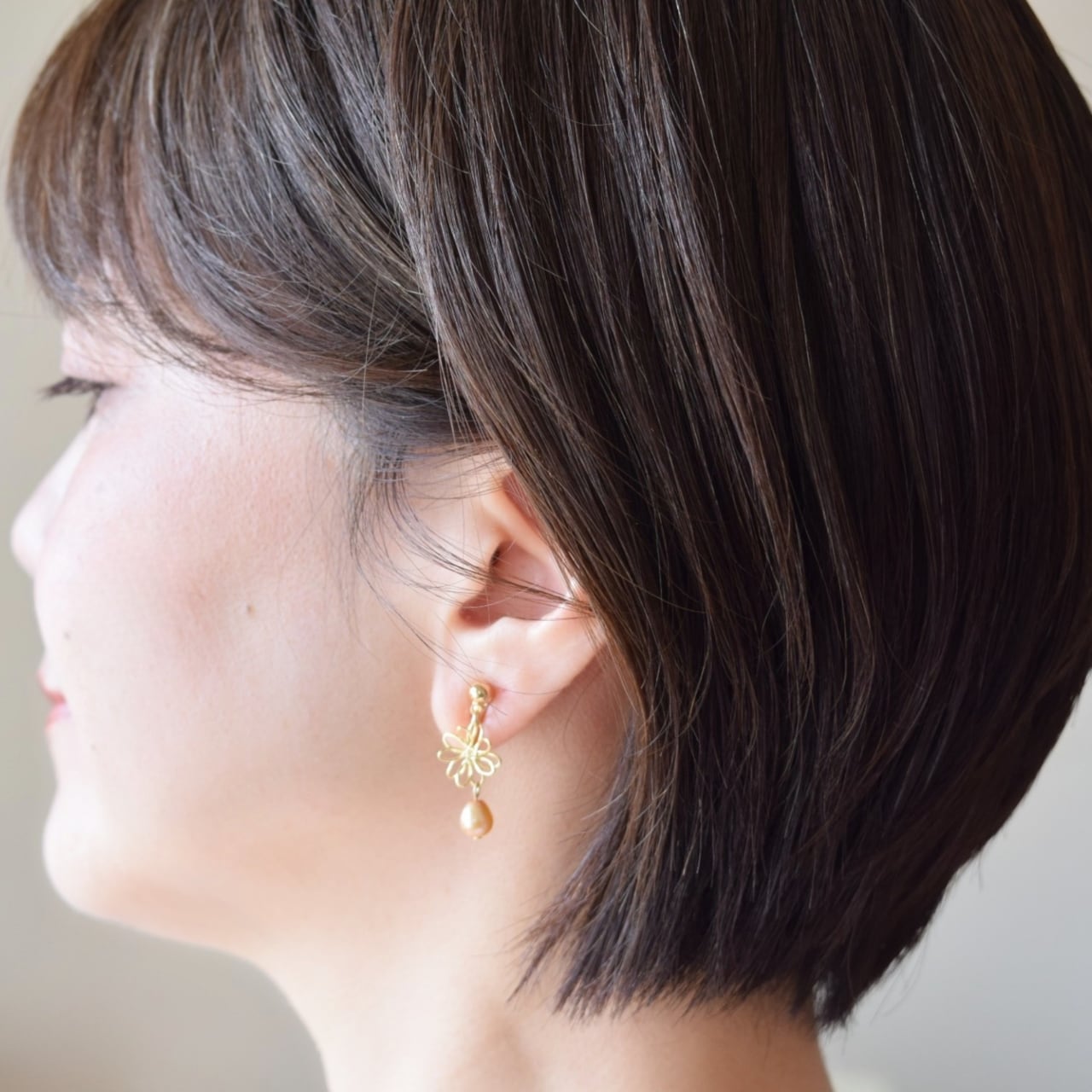ワイヤーで成形した立体的なデザインのフラワーモチーフに、パールを合わせたデザイン。
