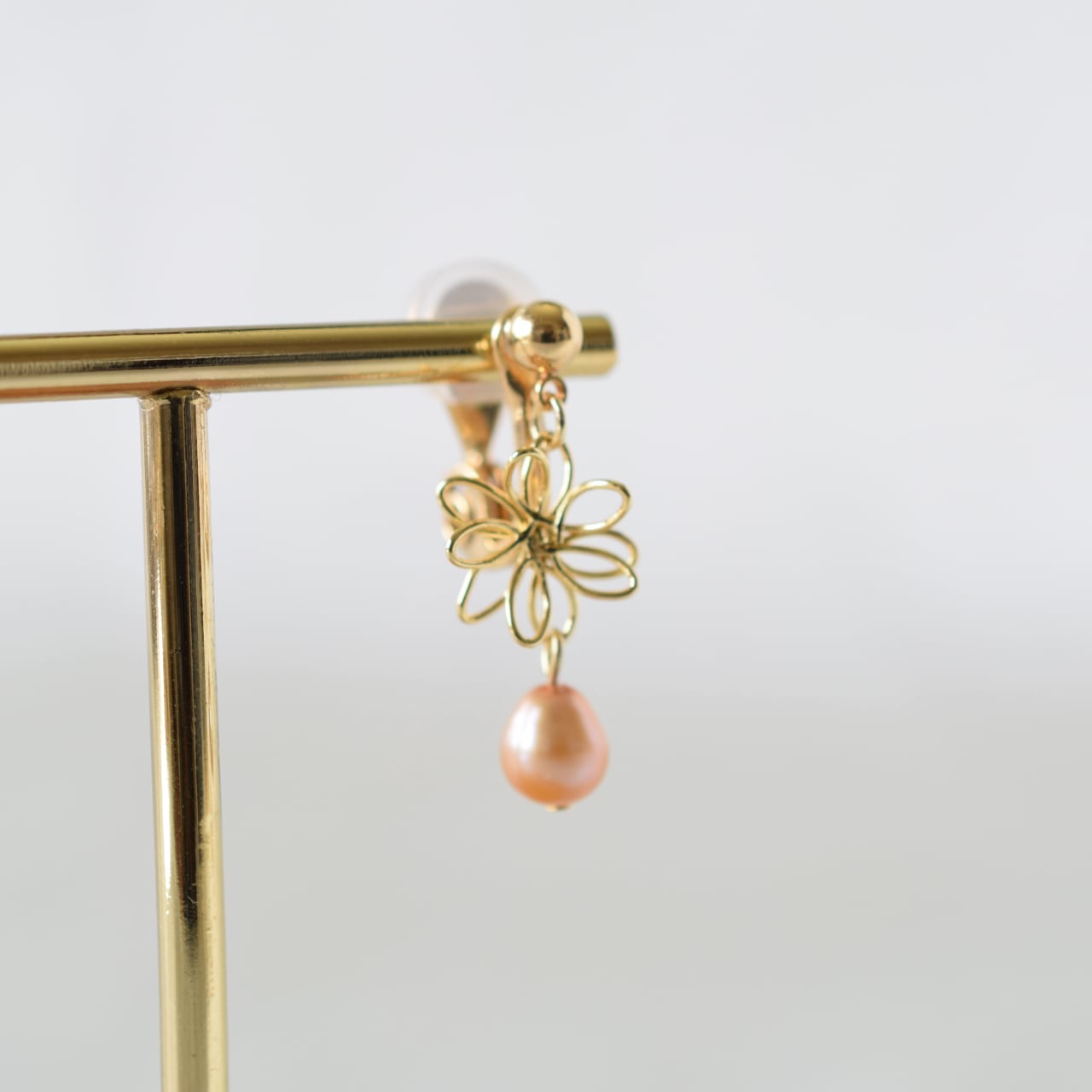 ワイヤーフラワー×パール ゴールド 魔法のイヤリング 痛くない 日本製 福耳ok 金属アレルギー対応 落ちない お花モチーフシンプル 大人 ピアス風 揺れる 送料無料