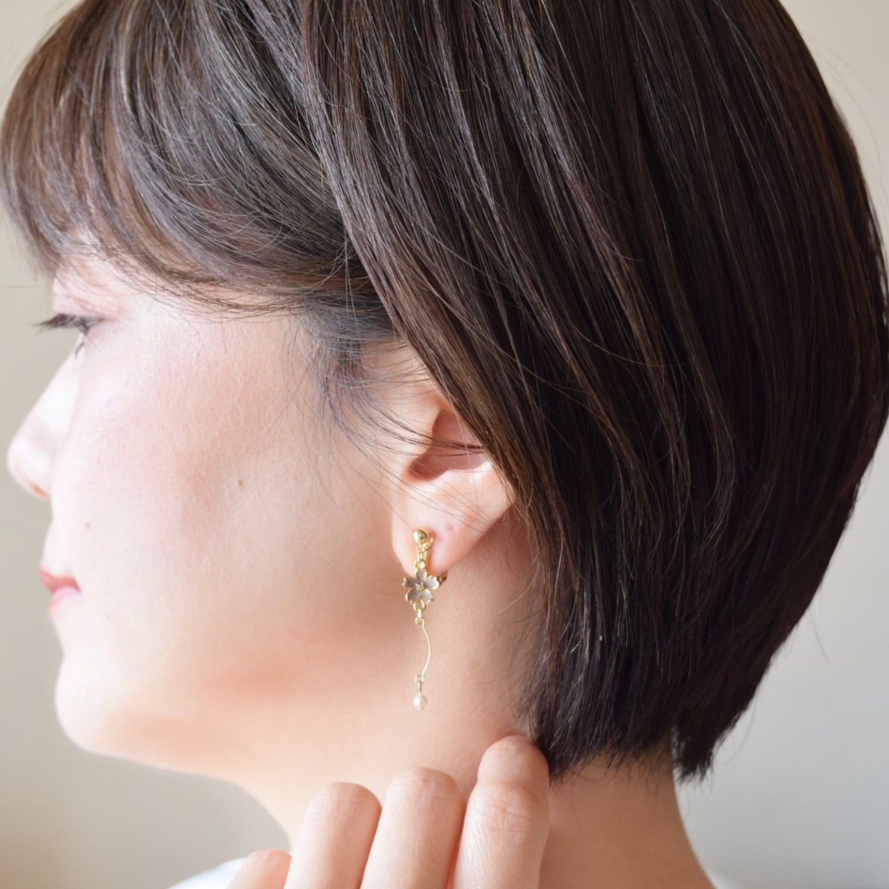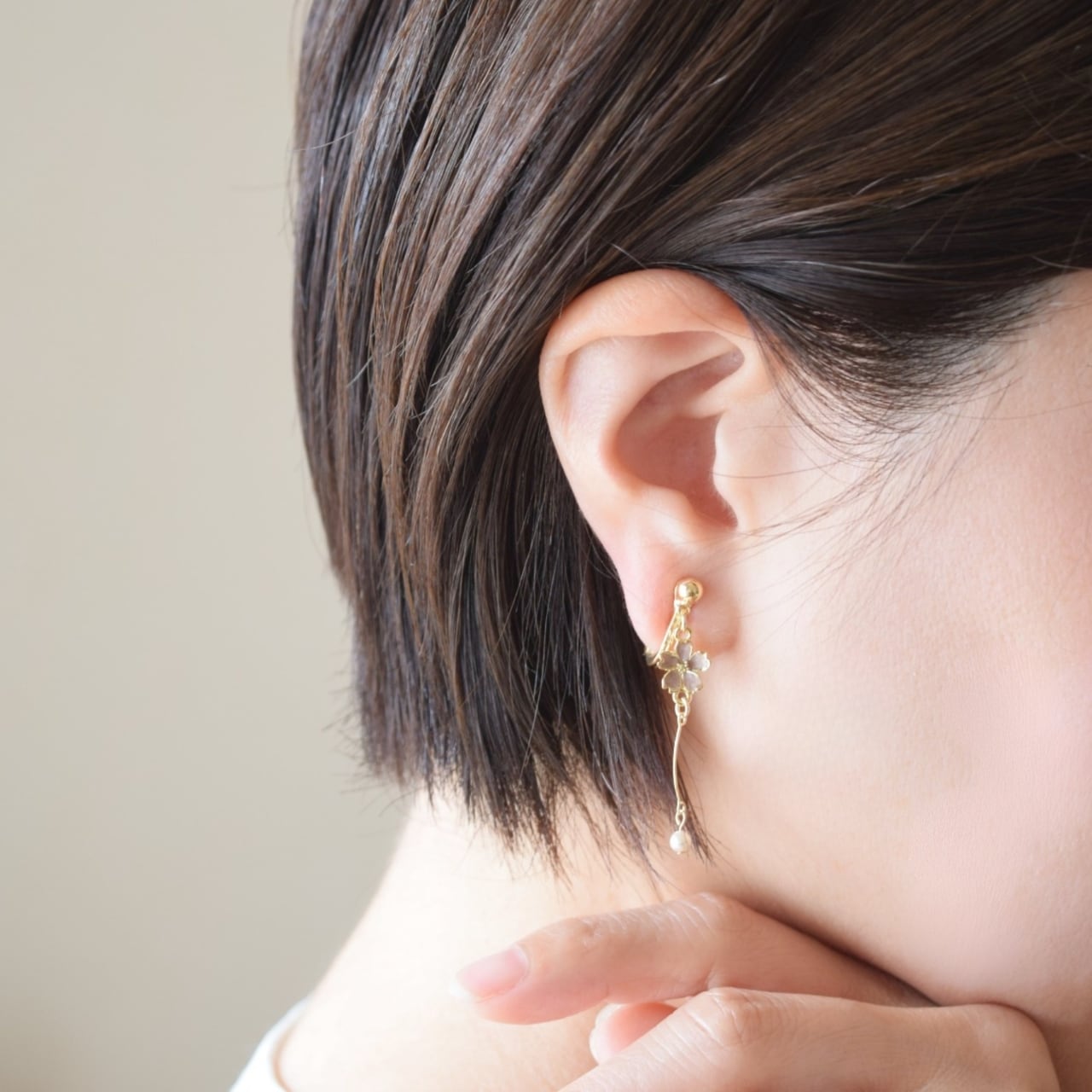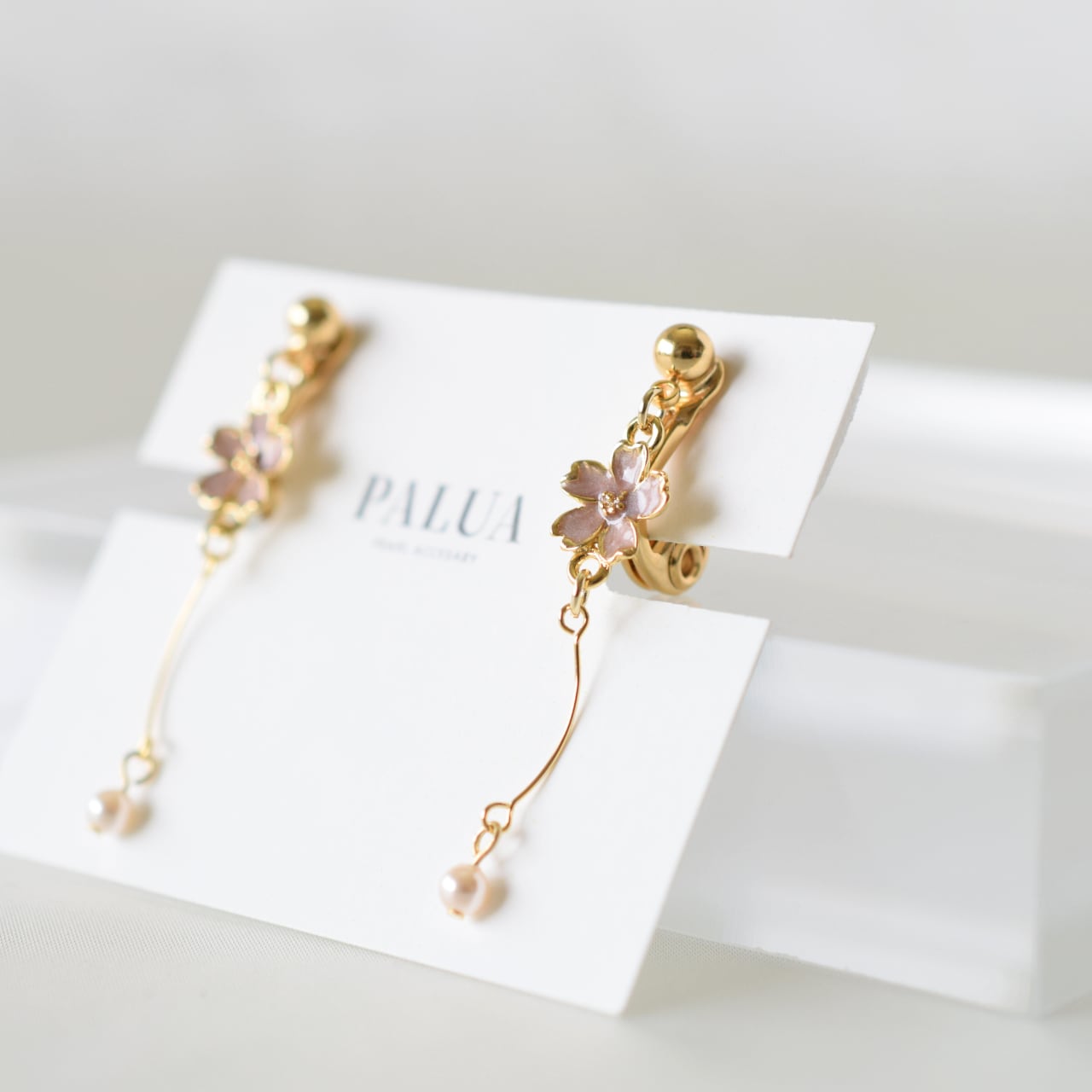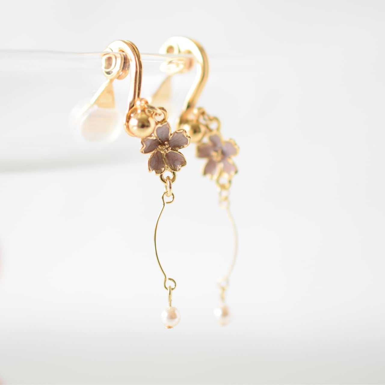 大人の女性に似合うニュアンスカラーの桜チャームに、美しい曲線を繋げ、先端には一粒のパールをあしらいました。