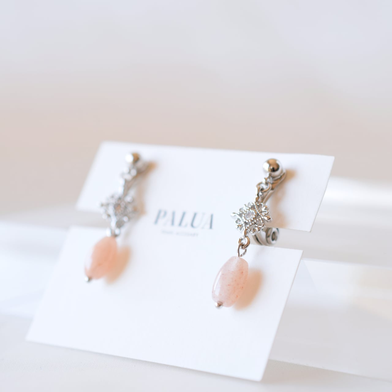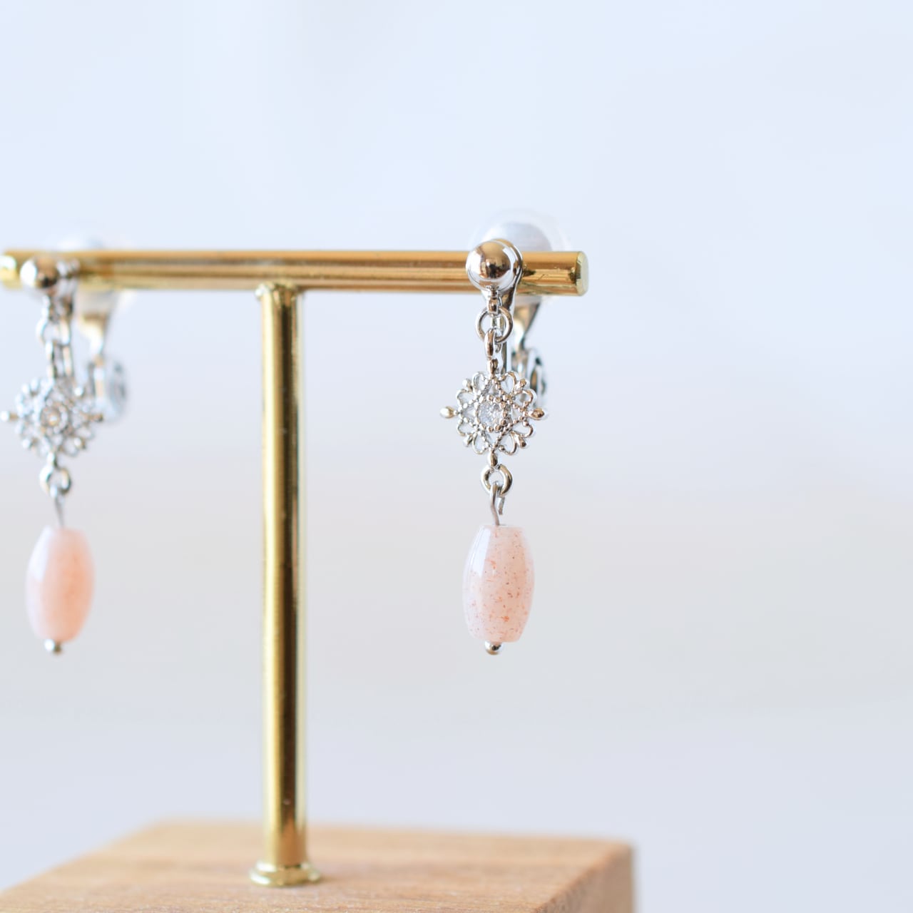 繊細な透かし模様のモチーフに、透明感のあるピンクムーンストーンを合わせたデザイン。